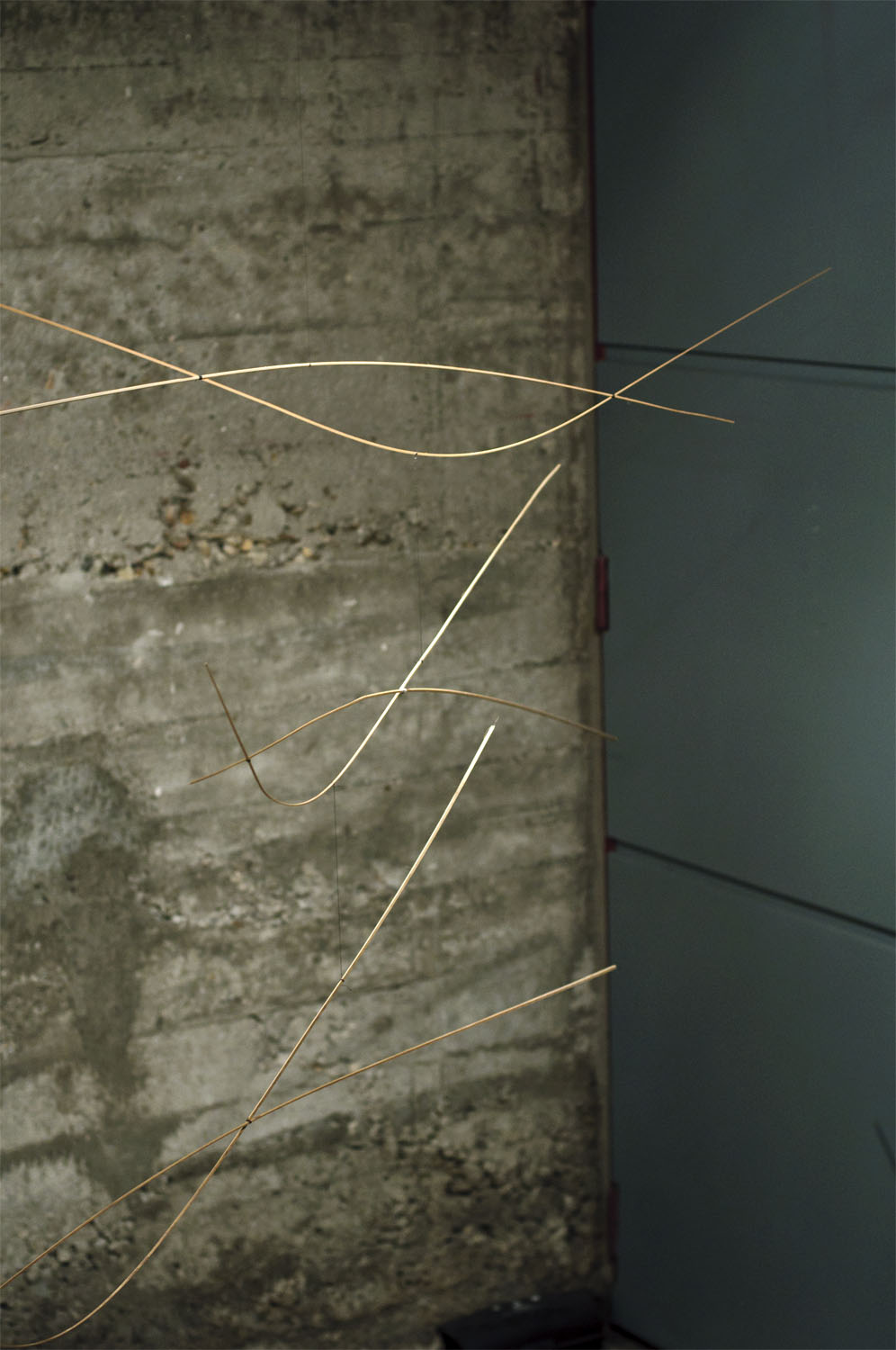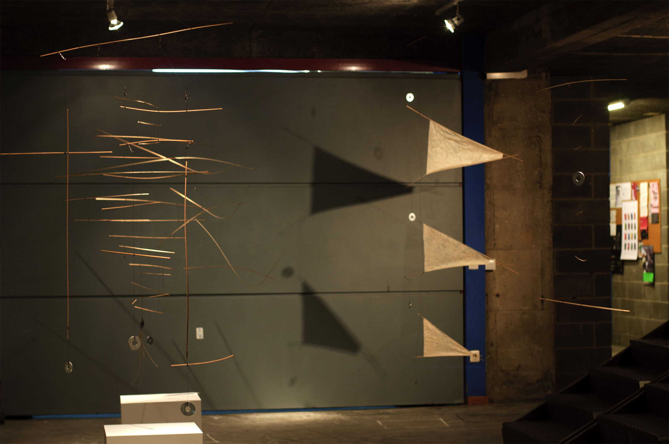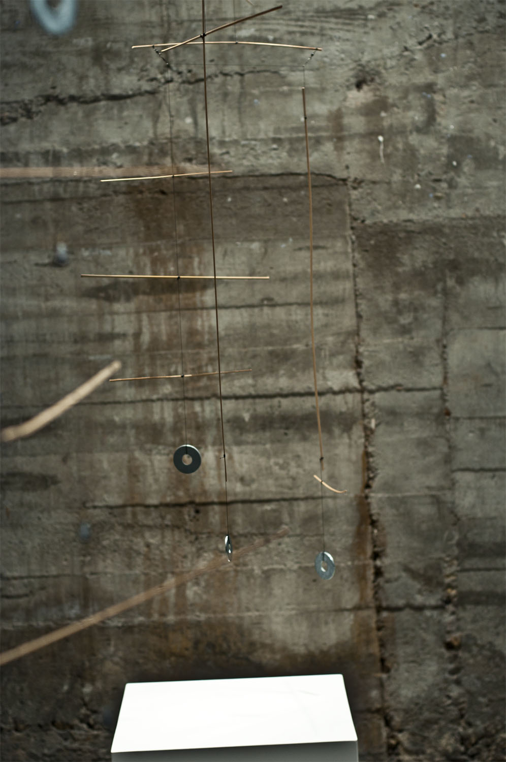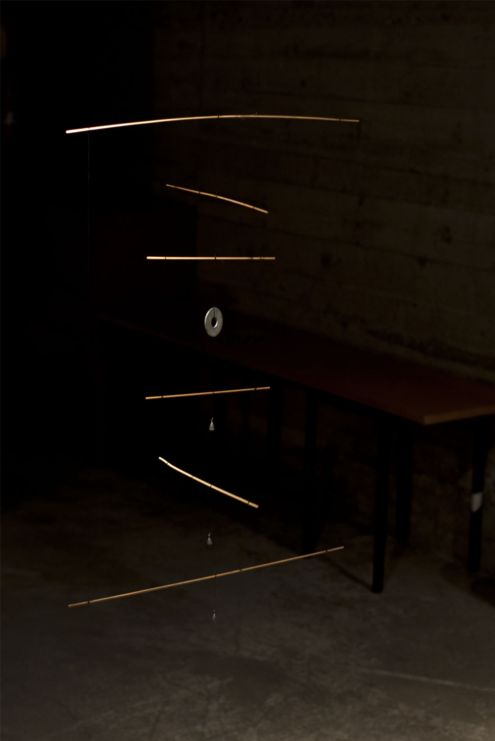Unhas cousas lévannos ás outras. Fai catro anos máis ou menos, fixenme cunhas baras de pouco máis dun metro de longo, fabricadas a partires de tiras de bambú, e utiliceinas para construires unha estructura informal e tridimensional, que logo desfixen para realizares un elemento plano cun cordel do que pendurar as baras máis ou menos polo seu centro, compensándoas mediante peciñas de chumbo que facíanas cembar pola súa parte máis estreita e mantíñanas máis ou menos na horizontal ao tempo que adquirían un carácter orgánico e ingrávido. Decateime de que si as afastaba entre elas de xeito que non tropezasen e as liberaba da parede para deixalas xirar libremente no espazo , aquelo era un móbil.