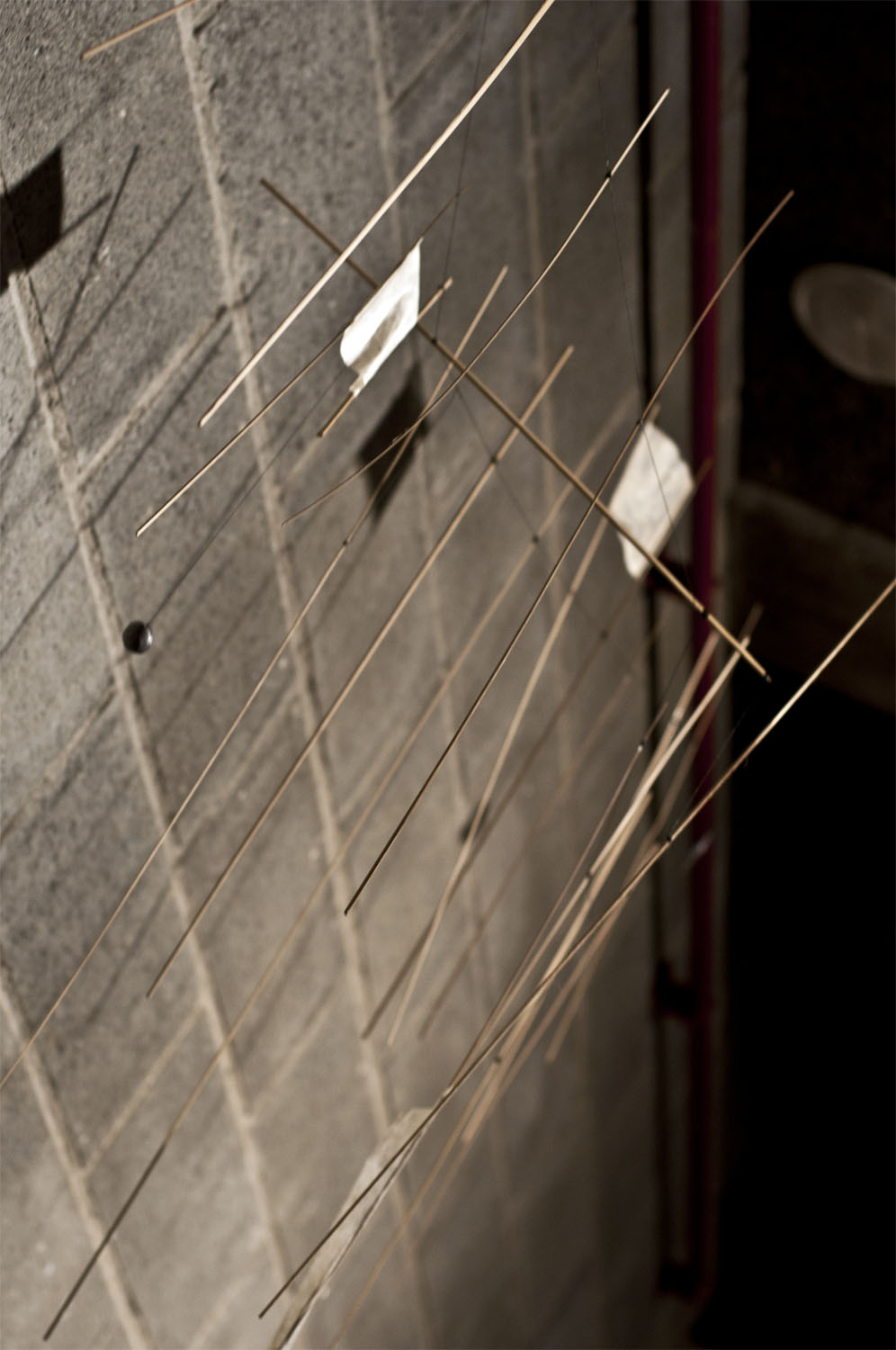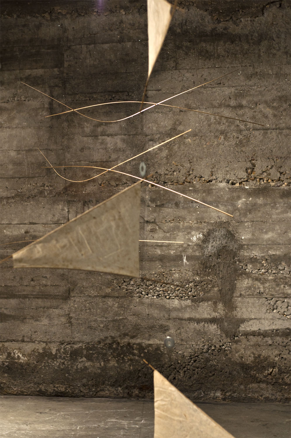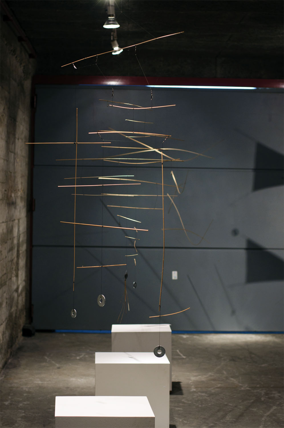 Unhas cousas lévannos ás outras. Fai catro anos máis ou menos, fixenme cunhas baras de pouco máis dun metro de longo, fabricadas a partires de tiras de bambú, e utiliceinas para construires unha estructura informal e tridimensional, que logo desfixen para realizares un elemento plano cun cordel do que pendurar as baras máis ou menos polo seu centro, compensándoas mediante peciñas de chumbo que facíanas cembar pola súa parte máis estreita e mantíñanas máis ou menos na horizontal ao tempo que adquirían un carácter orgánico e ingrávido. Decateime de que si as afastaba entre elas de xeito que non tropezasen e as liberaba da parede para deixalas xirar libremente no espazo , aquelo era un móbil.