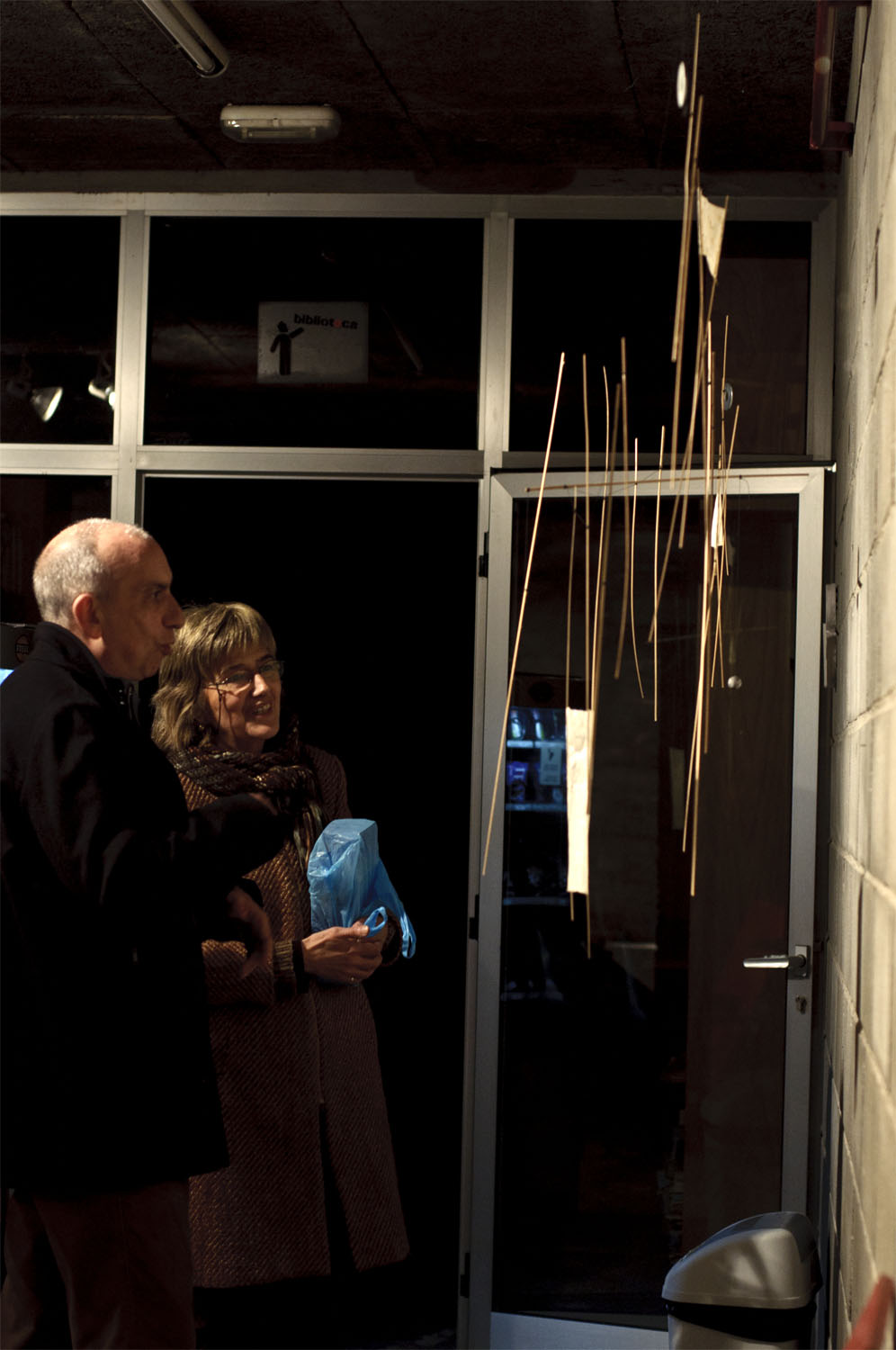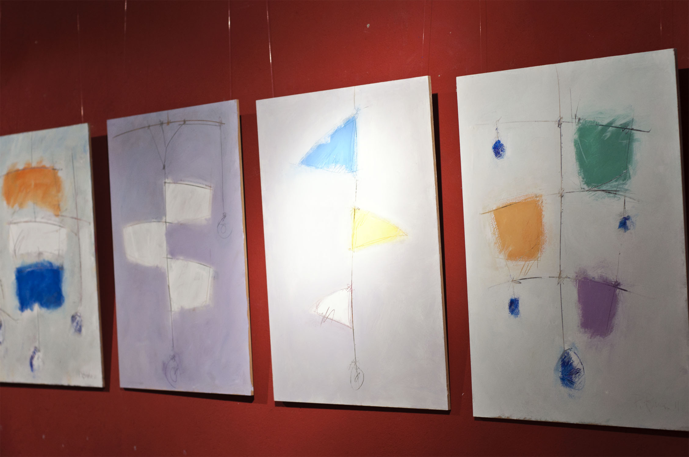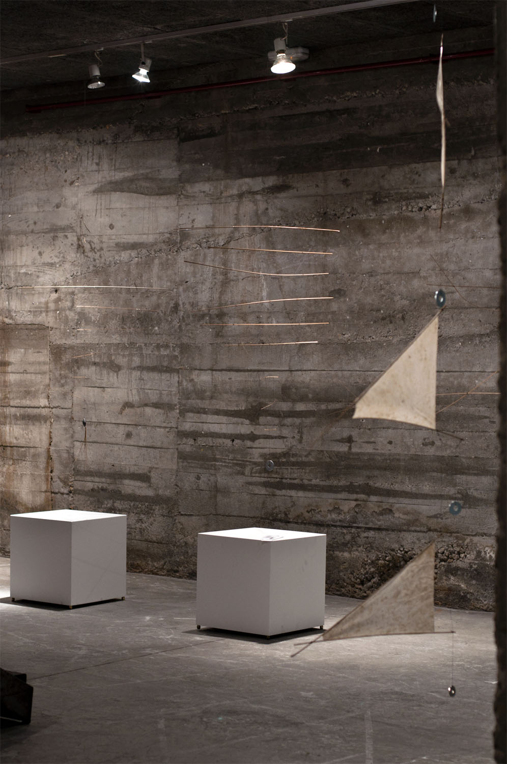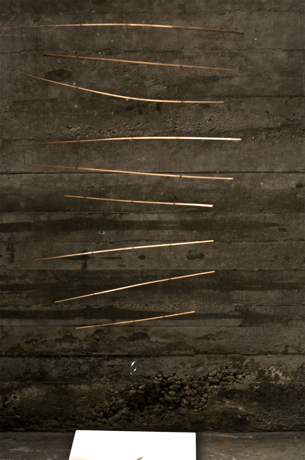 Unhas cousas lévannos ás outras. Fai catro anos máis ou menos, fixenme cunhas baras de pouco máis dun metro de longo, fabricadas a partires de tiras de bambú, e utiliceinas para construires unha estructura informal e tridimensional, que logo desfixen para realizares un elemento plano cun cordel do que pendurar as baras máis ou menos polo seu centro, compensándoas mediante peciñas de chumbo que facíanas cembar pola súa parte máis estreita e mantíñanas máis ou menos na horizontal ao tempo que adquirían un carácter orgánico e ingrávido. Decateime de que si as afastaba entre elas de xeito que non tropezasen e as liberaba da parede para deixalas xirar libremente no espazo , aquelo era un móbil.