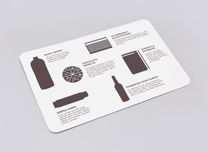 A axencia mexicana menosunocerouno creou un kit de supervivencia para o fin do mundo baixo o título Just in case (por se acaso). Este, está composto por diferentes e atractivos deseños de packaging e papelaría que serviron como regalo promocional da propia empresa.