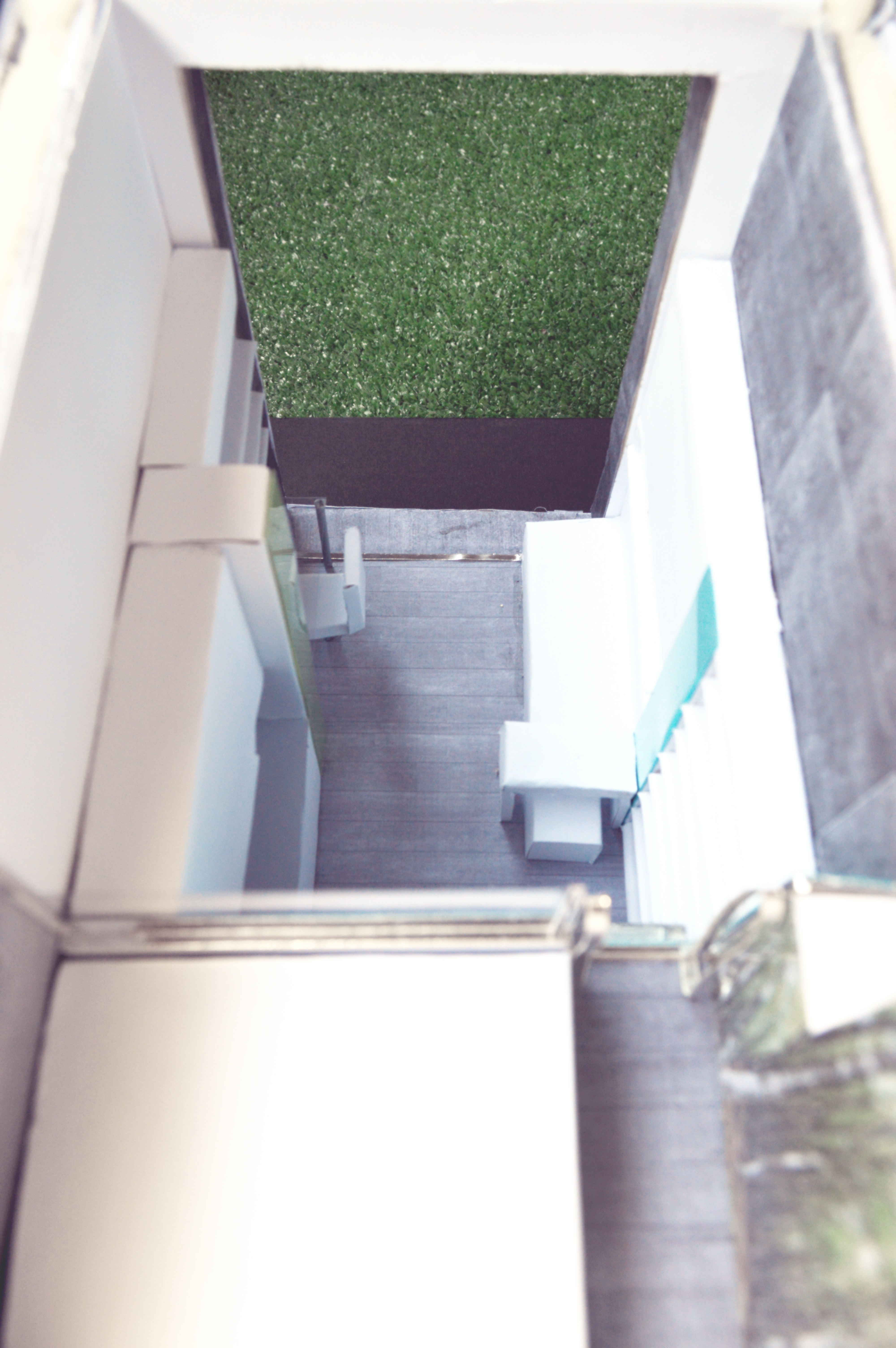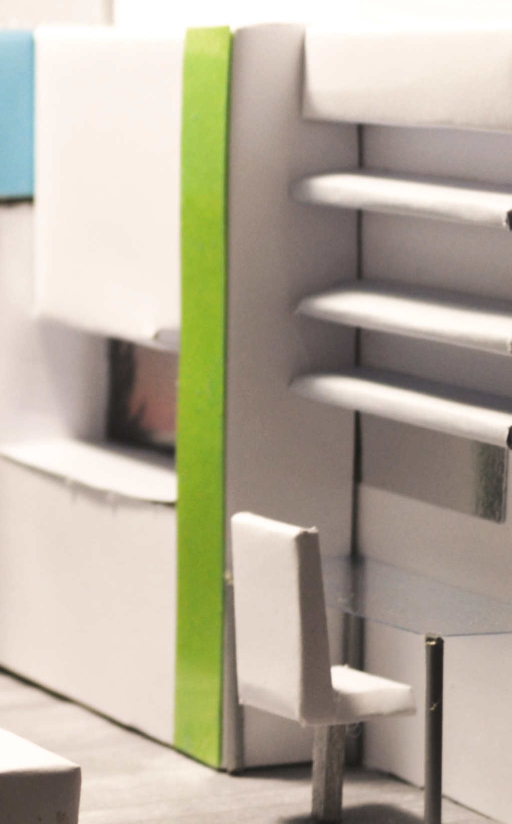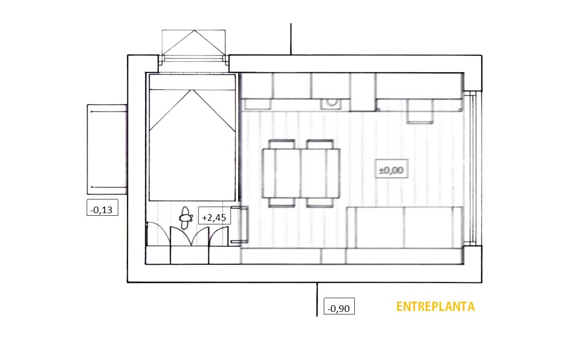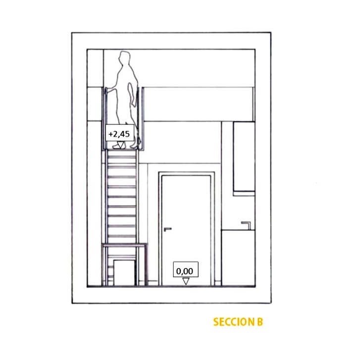 Mestúranse mobles actuais e lixeiros coa robustez do formigón visto, pretendendo unha estética urbana e industrial. As cores dominantes son o gris e o branco, achegando luz co verde e o turquesa. Porporciónase calidez a través do mobiliario de taboleiro en DM, a tarima de carballo e o revestimiento de madeira cor prata.
