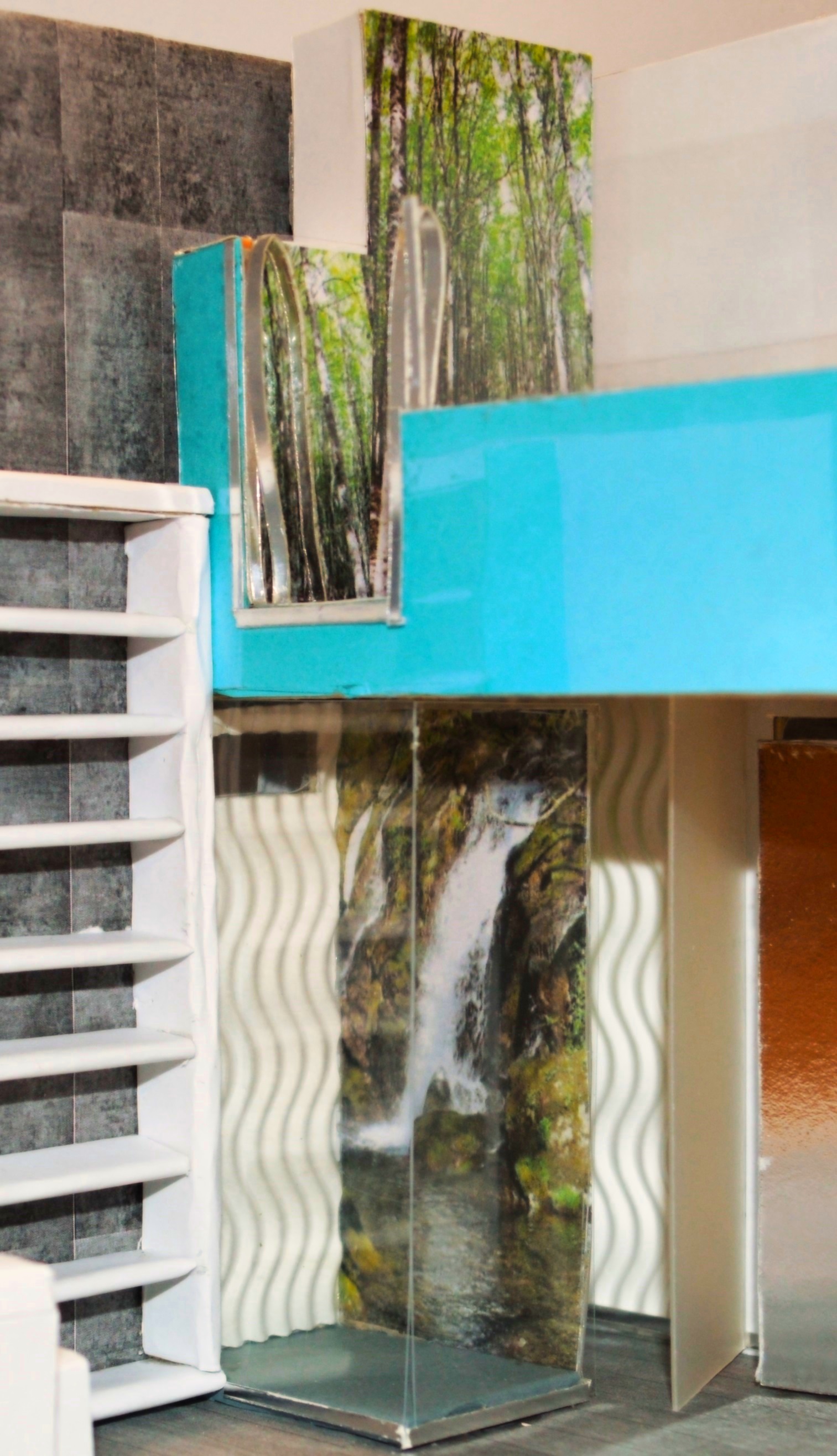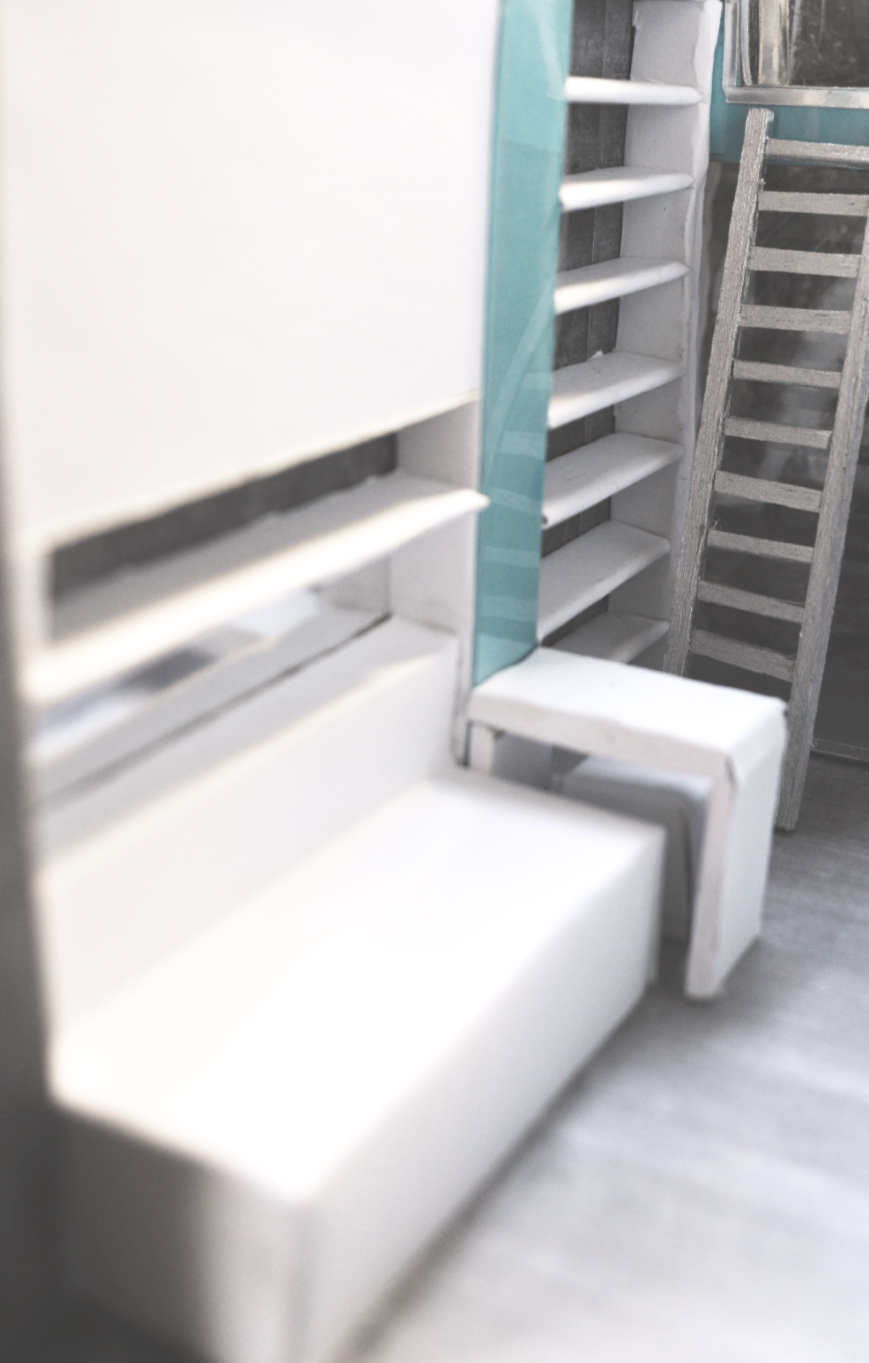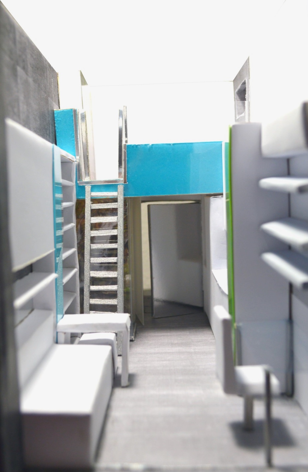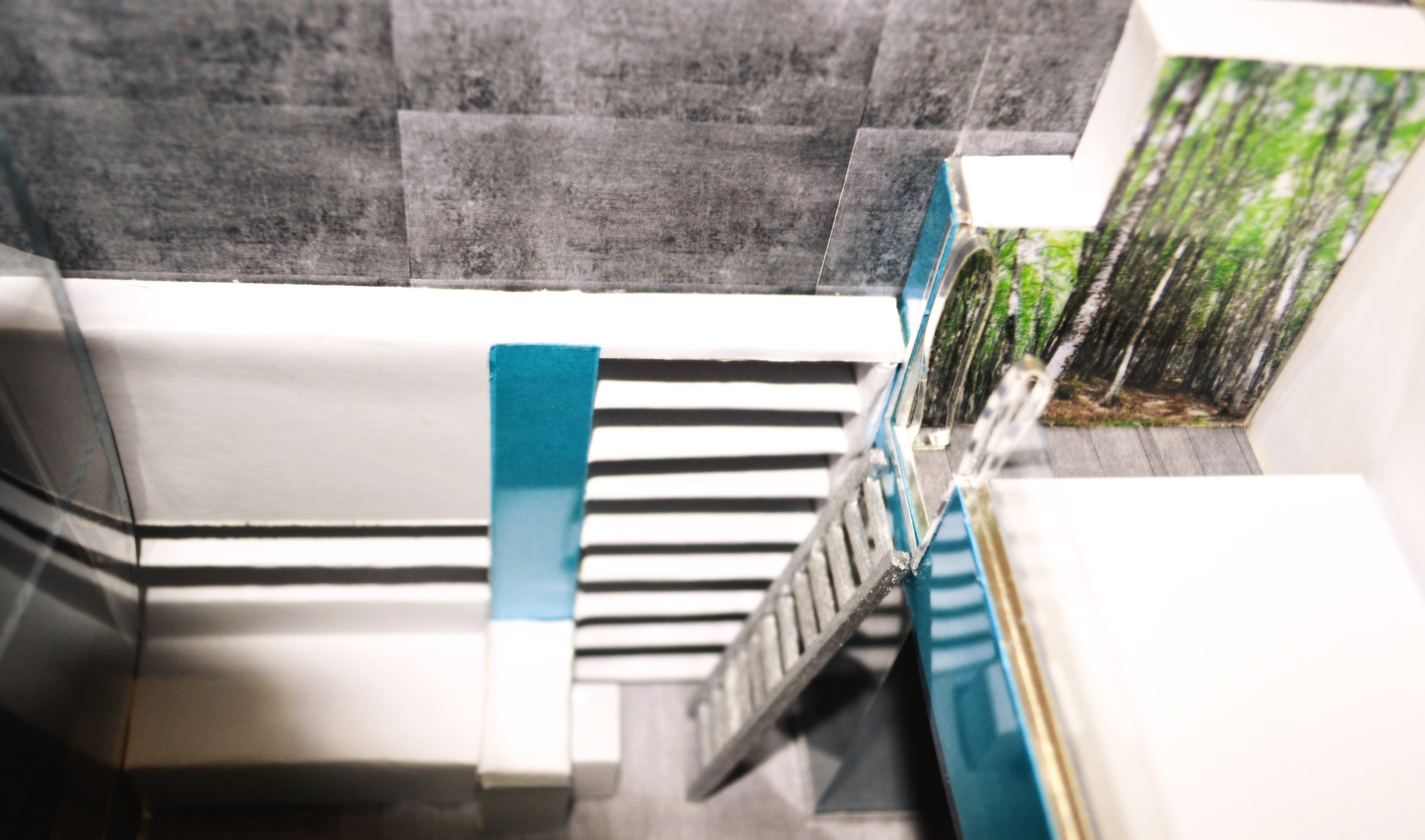 Mestúranse mobles actuais e lixeiros coa robustez do formigón visto, pretendendo unha estética urbana e industrial. As cores dominantes son o gris e o branco, achegando luz co verde e o turquesa. Porporciónase calidez a través do mobiliario de taboleiro en DM, a tarima de carballo e o revestimiento de madeira cor prata.