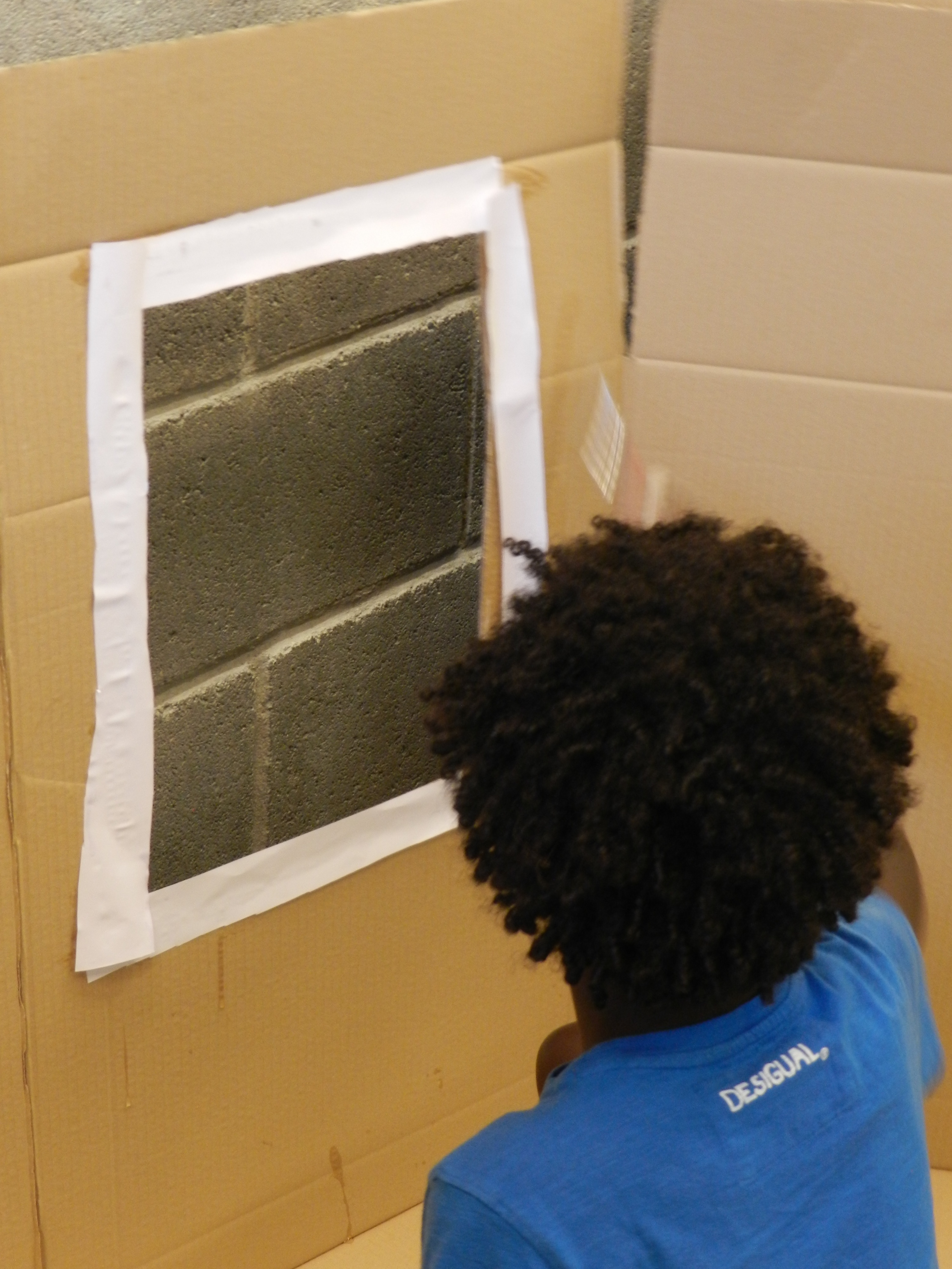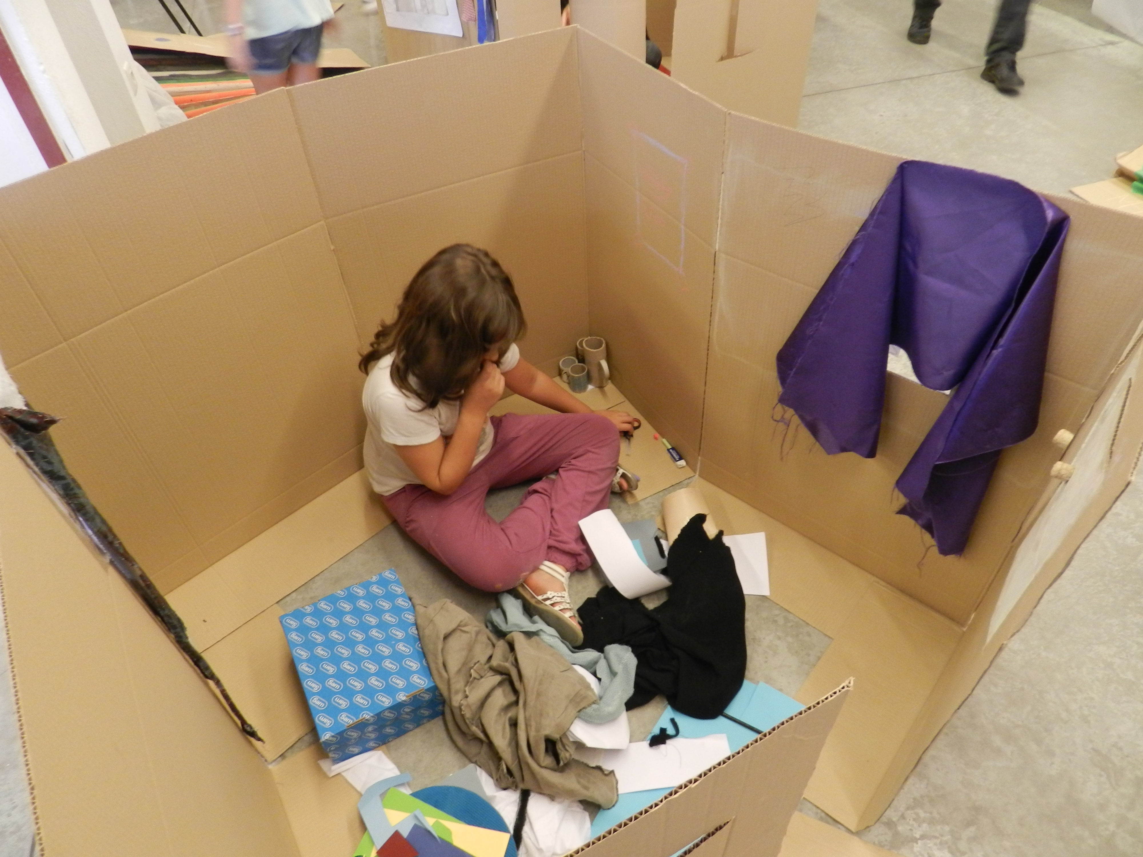 O día 1 de agosto fixemos unha casa de bonecas á escala «casi» real. Con caixas de cartón abertas por unha das súas caras, cada nen@ tiña que construir unha peza da casa (dormitorio, salón, cociña, …)