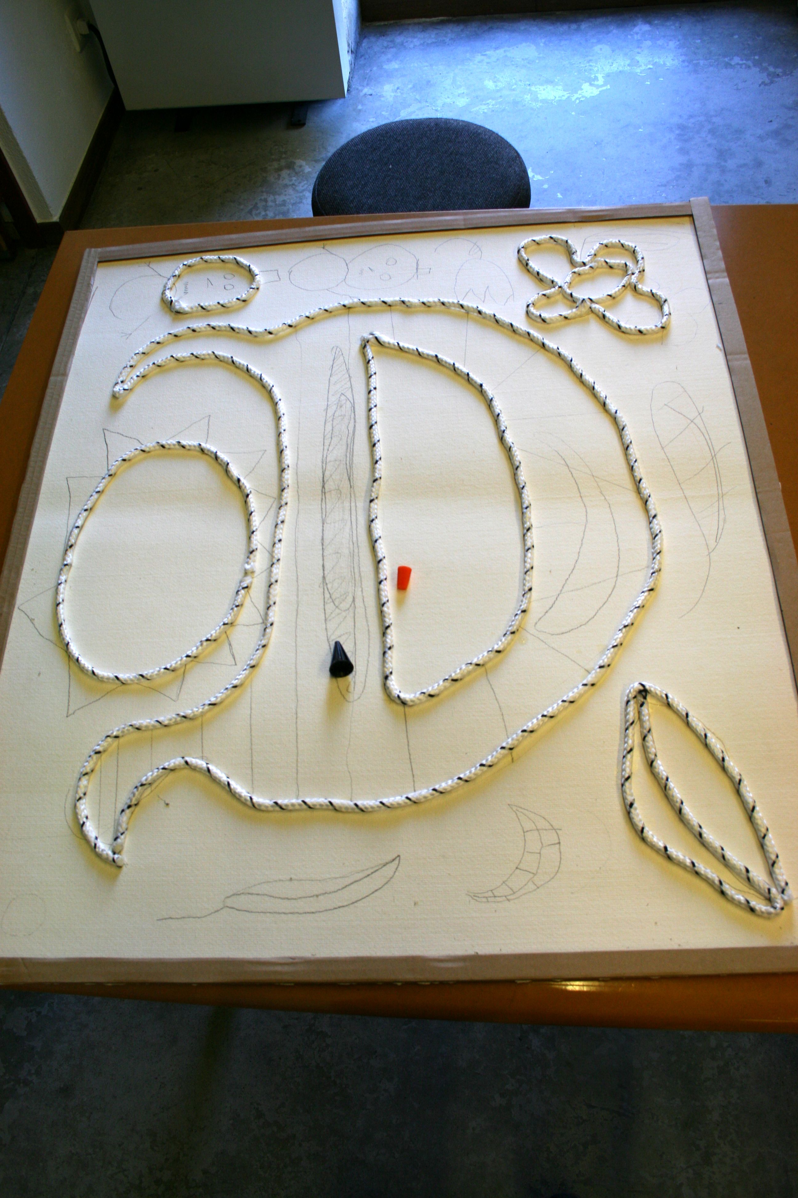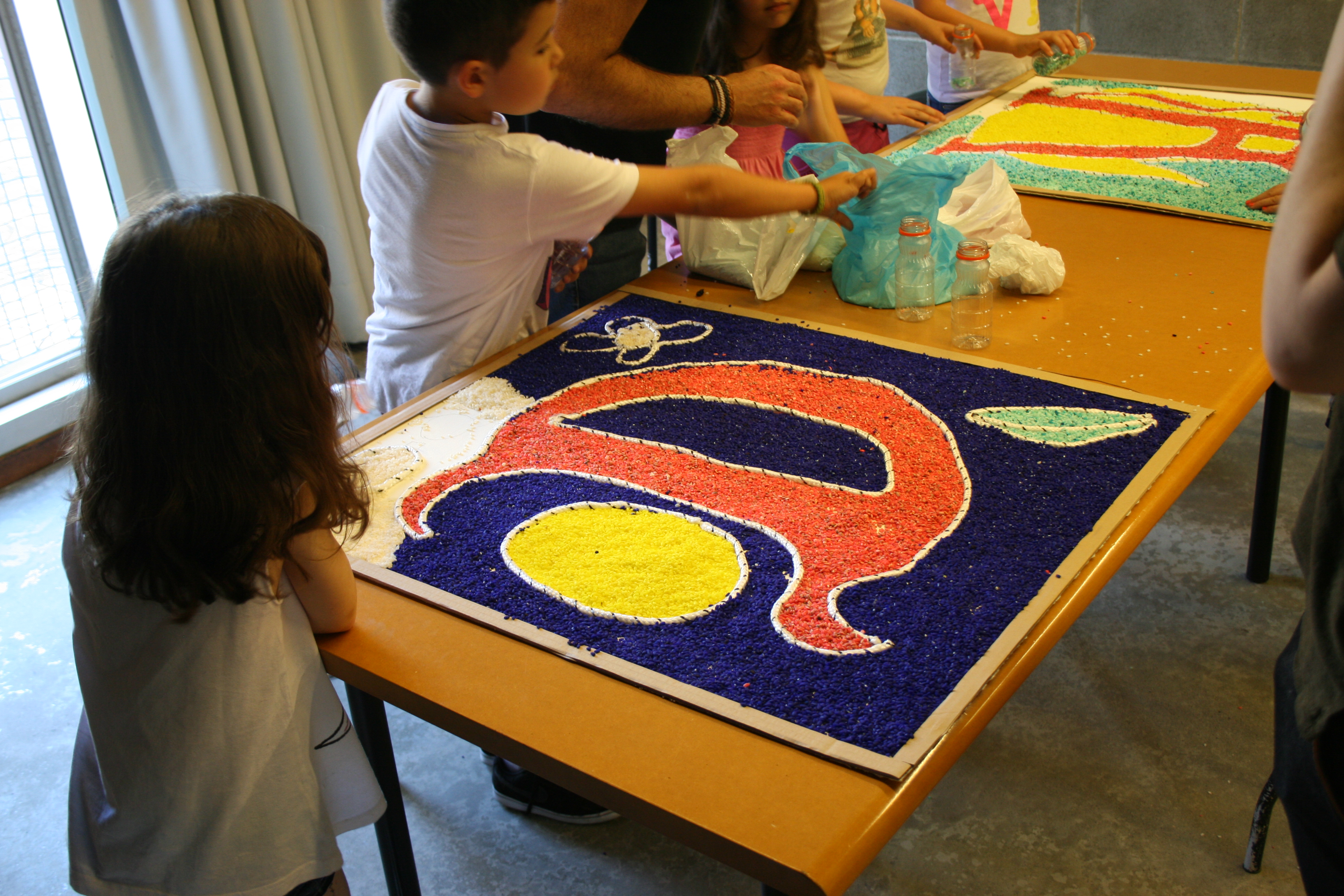 Divididos en grupos de tres, deseñamos unha letra capital (decorada) para reproducir cun tamaño de 1 x 1 m. A silueta das letras realizouse cunha corda flexible que delimita as zonas que posteriormente foron coloreadas con arroz tinguido.
